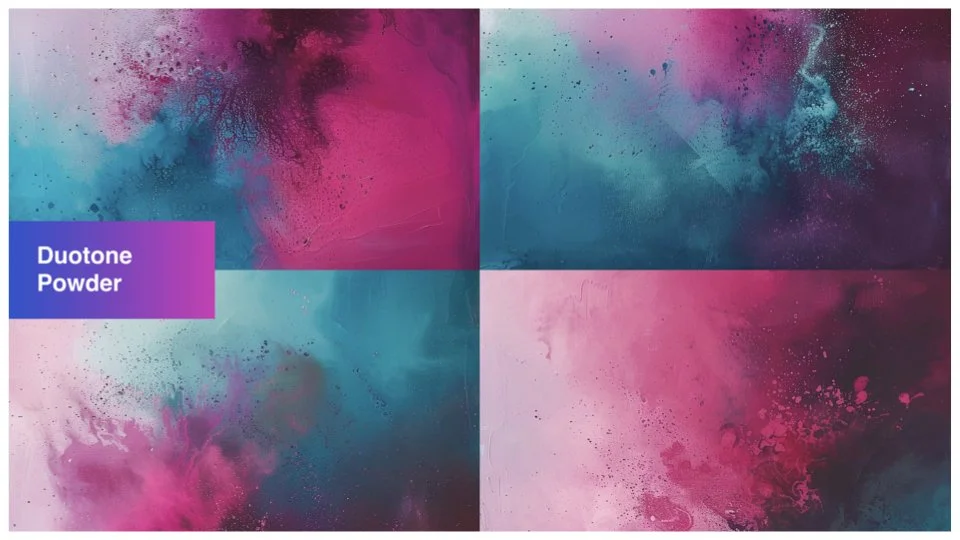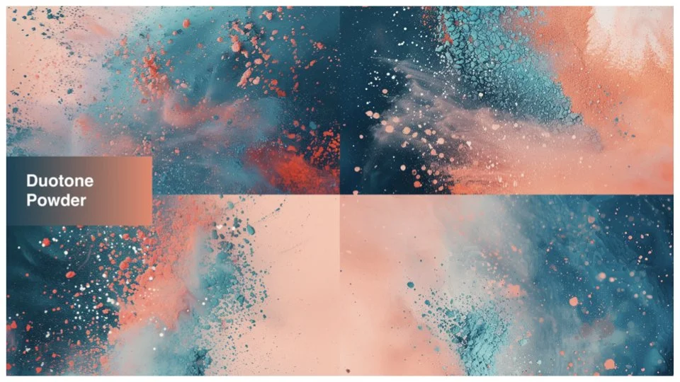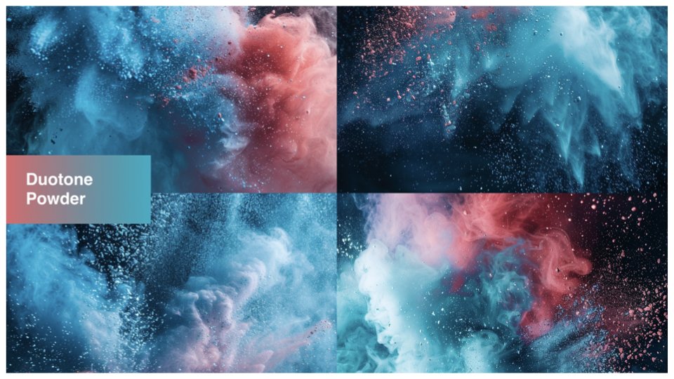 I imaged the powder being a stimulating media, especially when applied to motion. And reducing the color palette to duotone create less visual chaos, but also created opportunities to develop a wide set of color option combinations as a system.