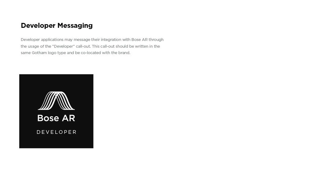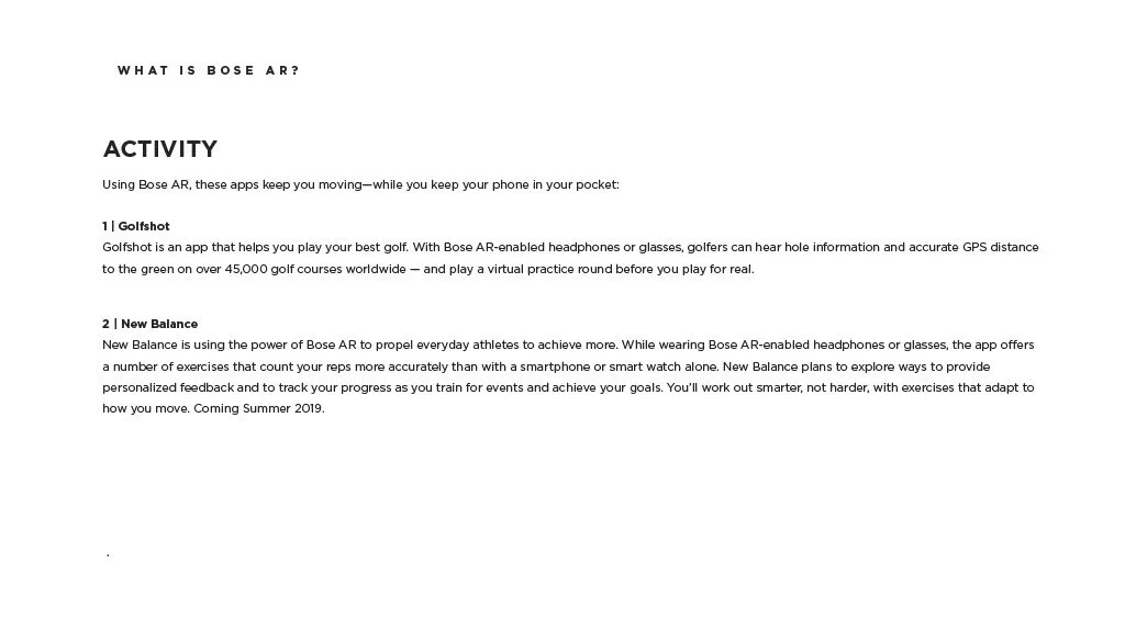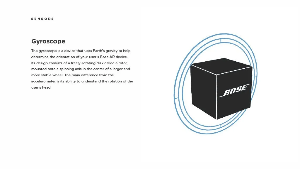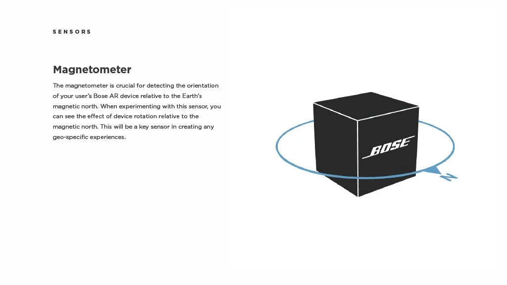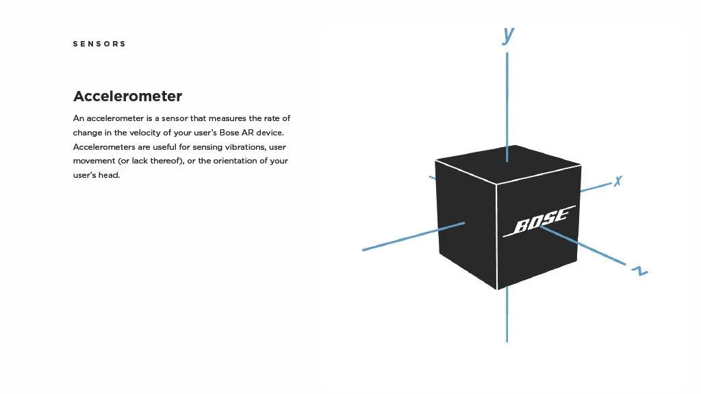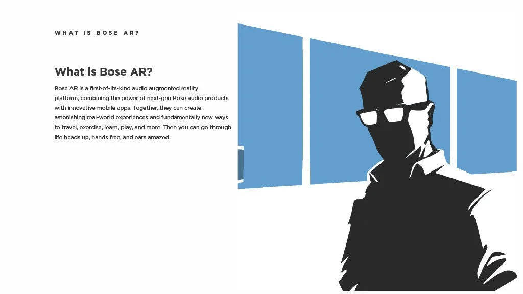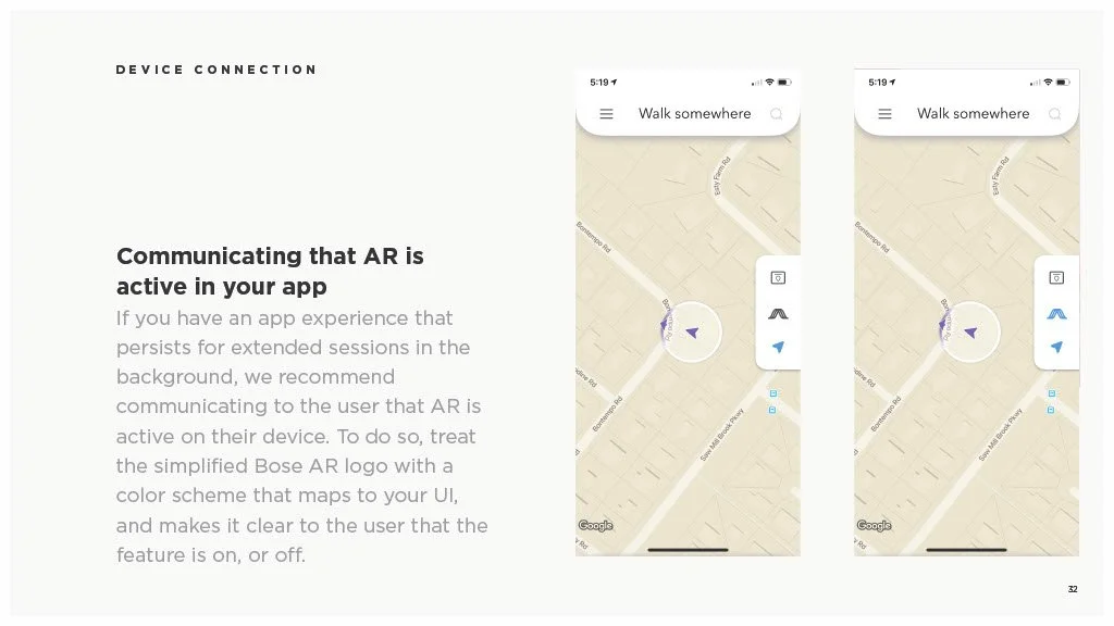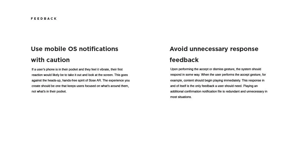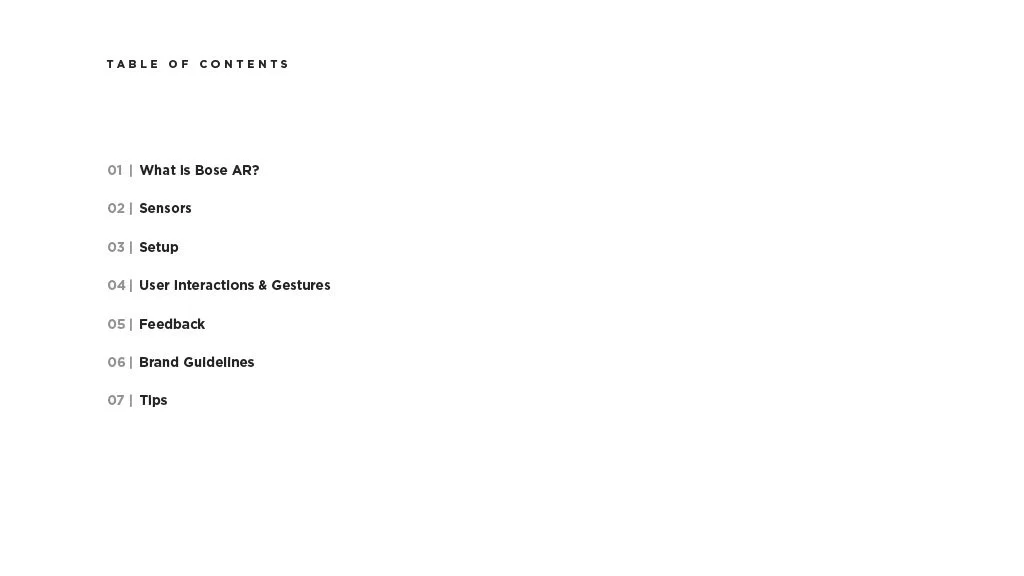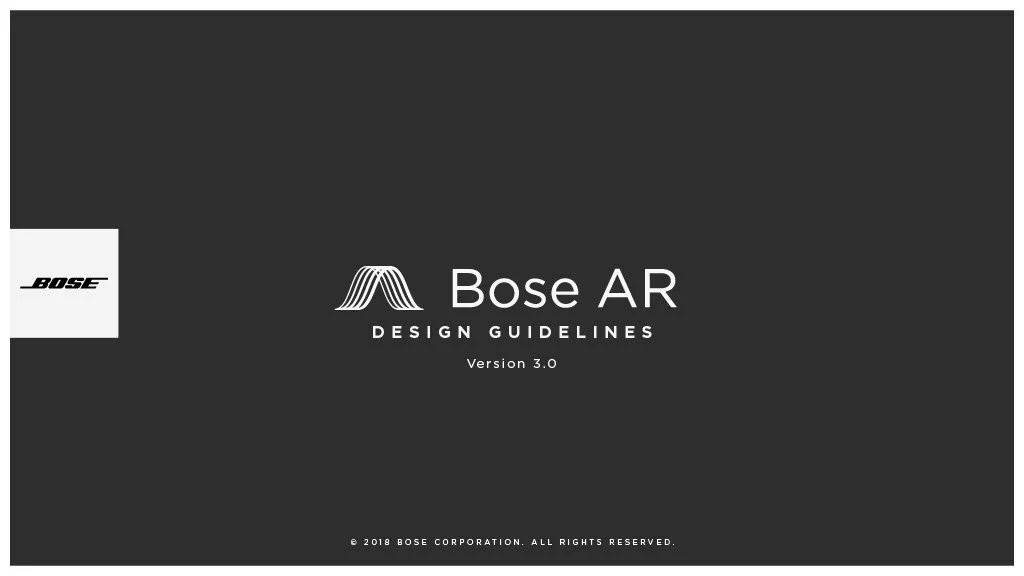 As a Principal Designer at Bose in the Bose labs department, I lead a cross-disciplinary team to create a comprehensive set of Design Guidelines for the companies Audio Augmented Reality platform, Bose AR. this document was created to inform and empower both our internal teams across departments, as well as our direct company partnerships, and independent developers. The information in this document spans information on the technical specifications, design patterns, and branding of the platform.