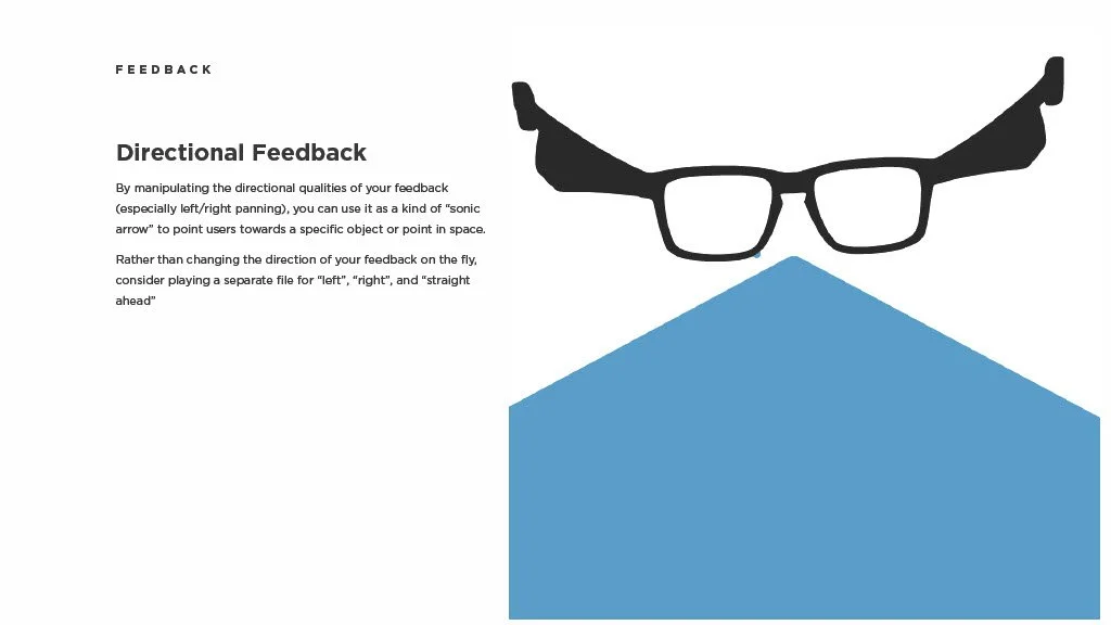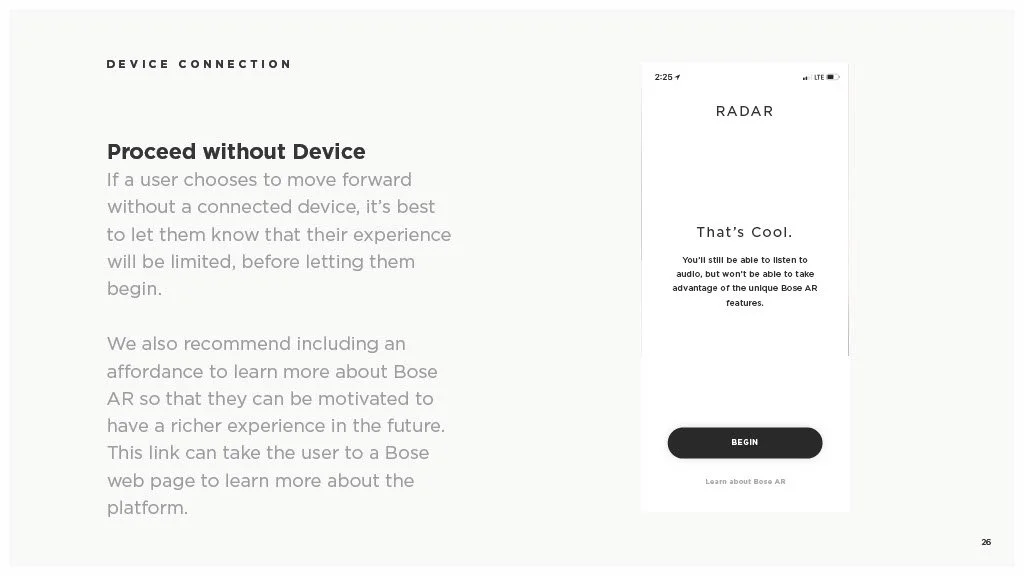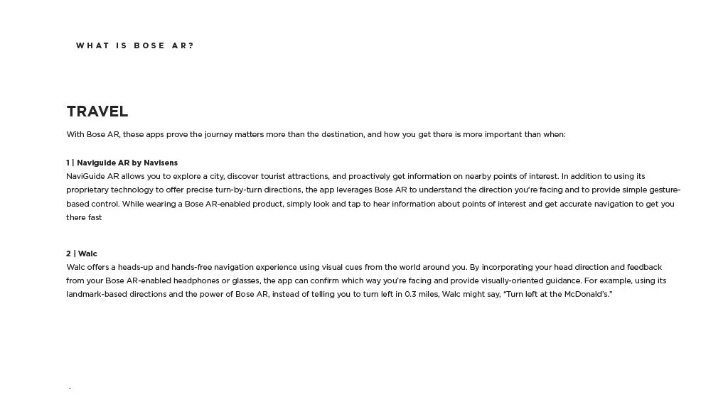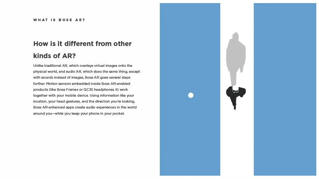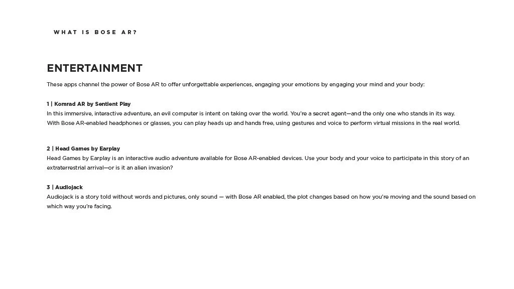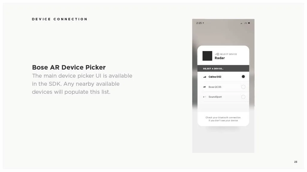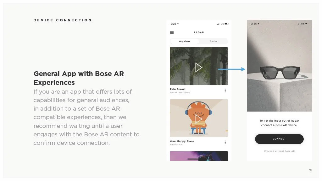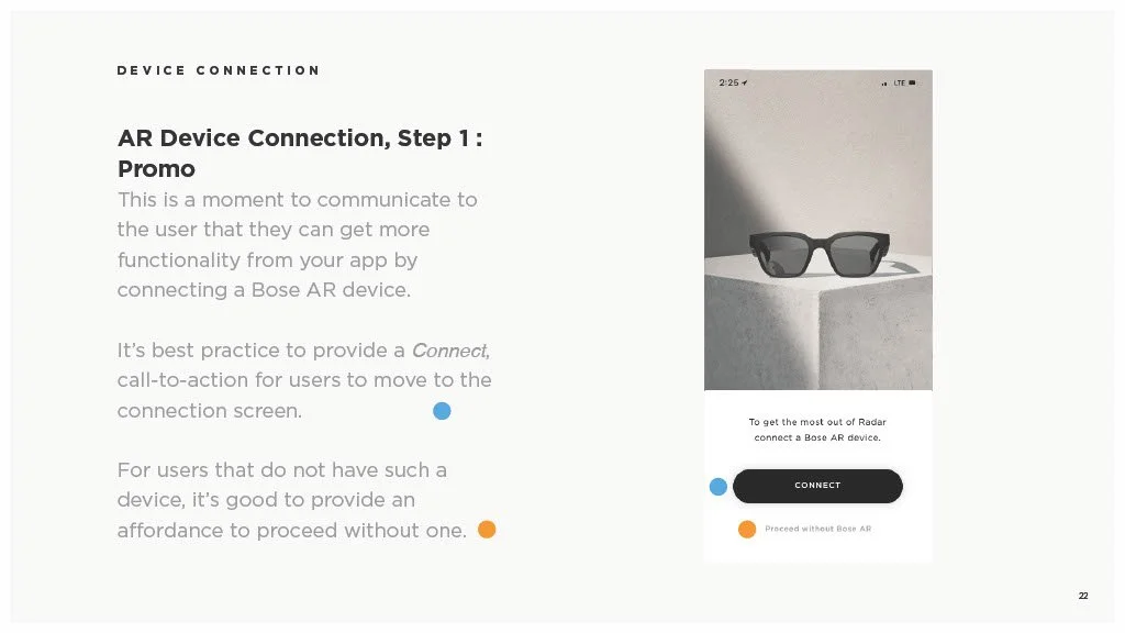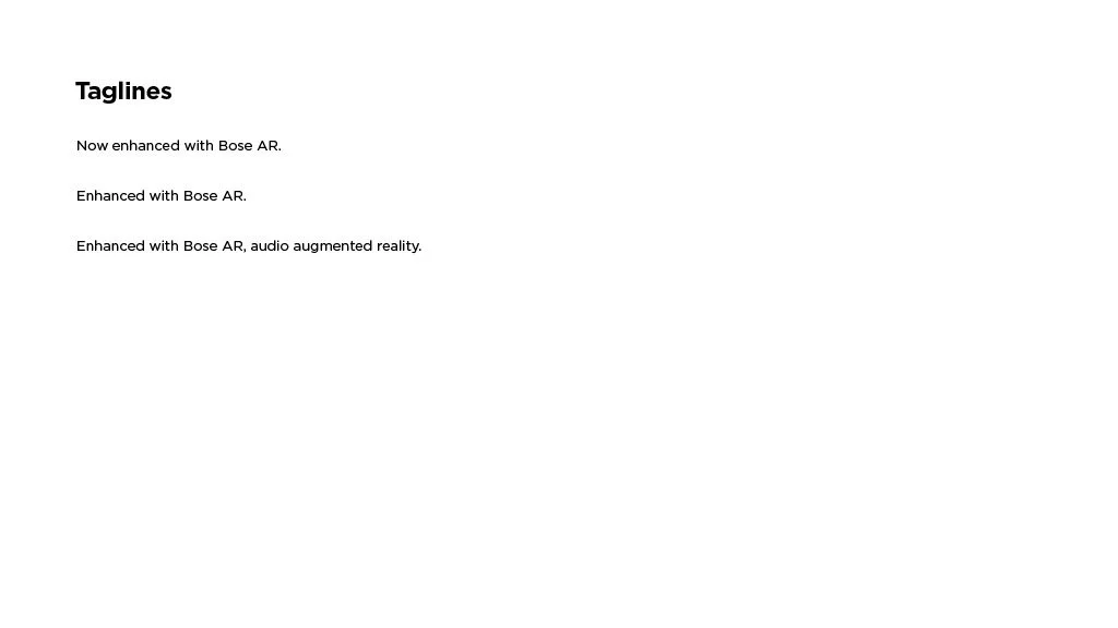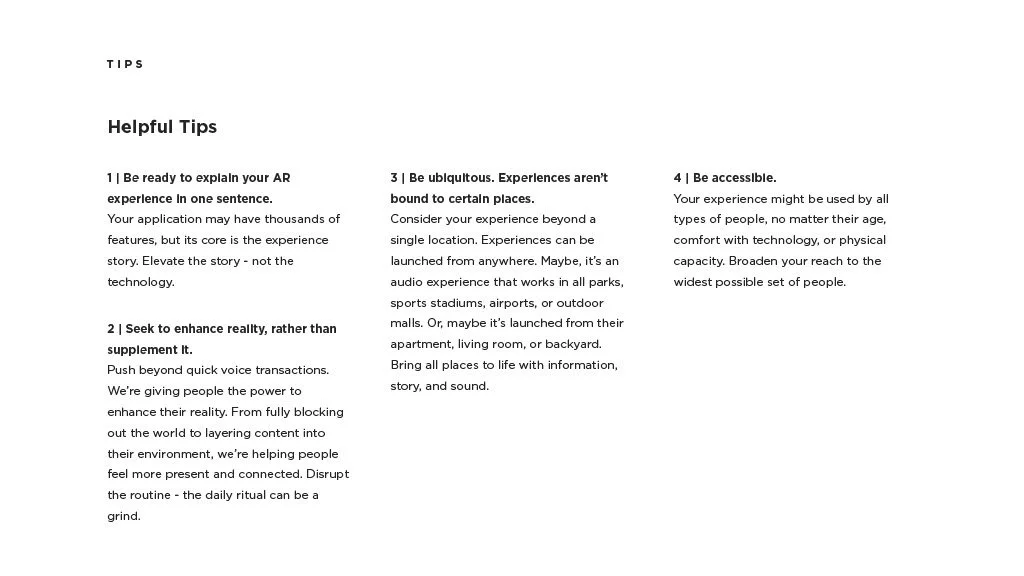 As a Principal Designer at Bose in the Bose labs department, I lead a cross-disciplinary team to create a comprehensive set of Design Guidelines for the companies Audio Augmented Reality platform, Bose AR. this document was created to inform and empower both our internal teams across departments, as well as our direct company partnerships, and independent developers. The information in this document spans information on the technical specifications, design patterns, and branding of the platform.