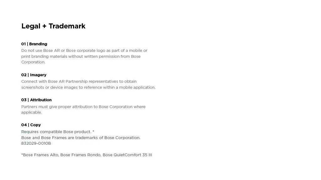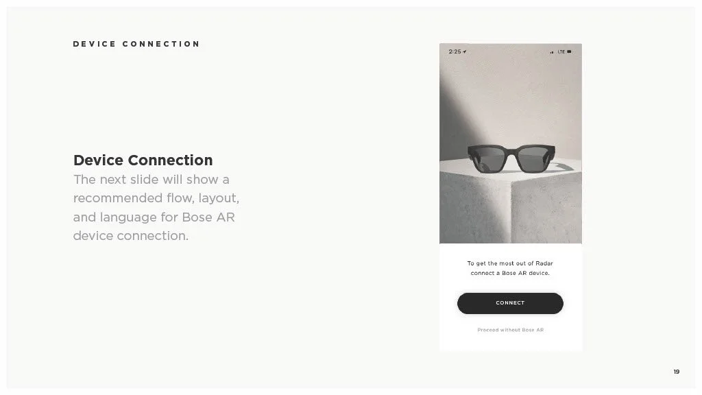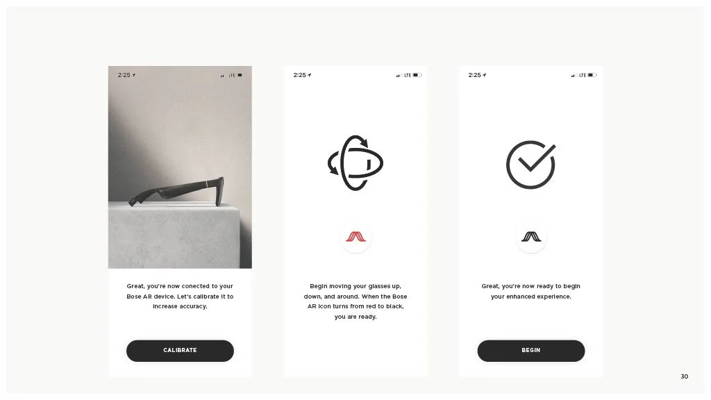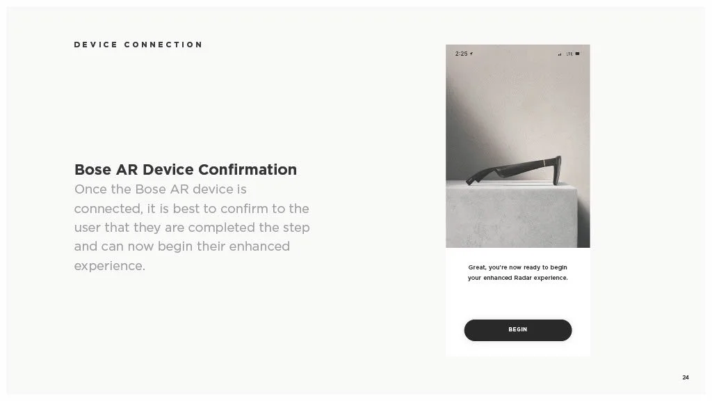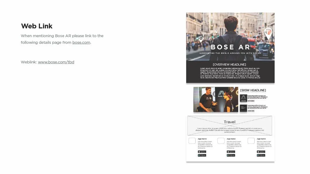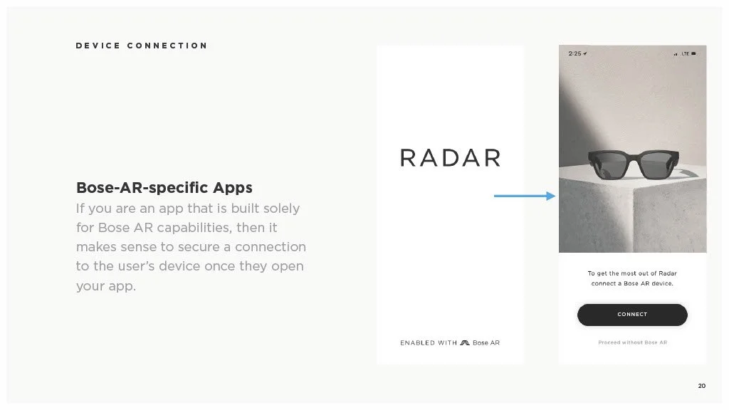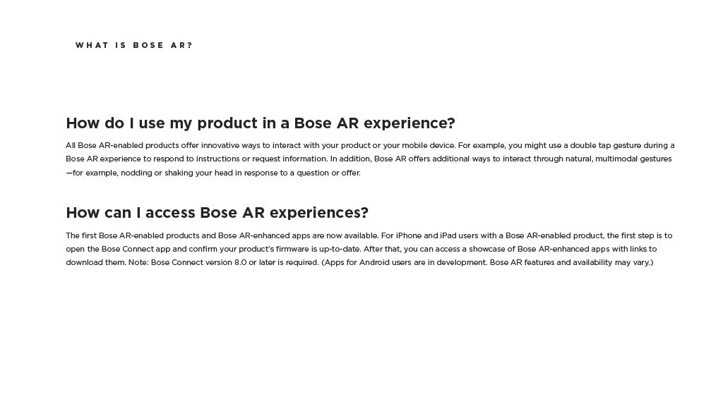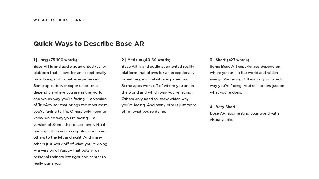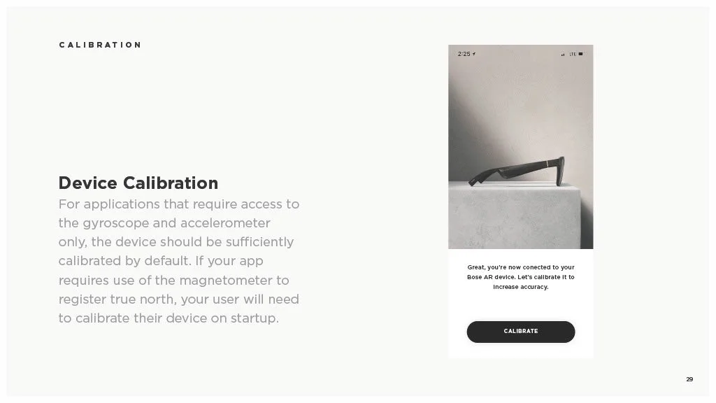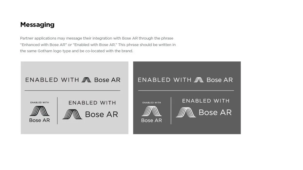 As a Principal Designer at Bose in the Bose labs department, I lead a cross-disciplinary team to create a comprehensive set of Design Guidelines for the companies Audio Augmented Reality platform, Bose AR. this document was created to inform and empower both our internal teams across departments, as well as our direct company partnerships, and independent developers. The information in this document spans information on the technical specifications, design patterns, and branding of the platform.