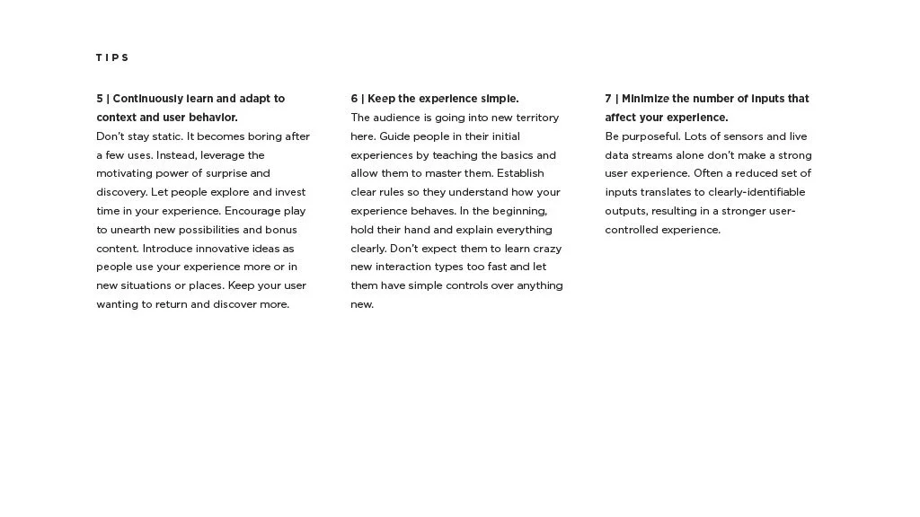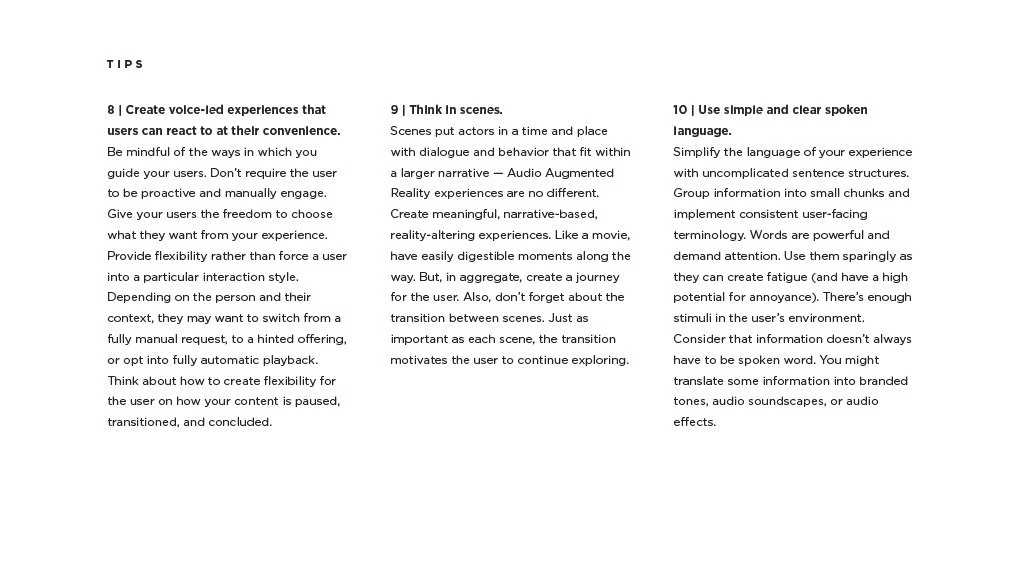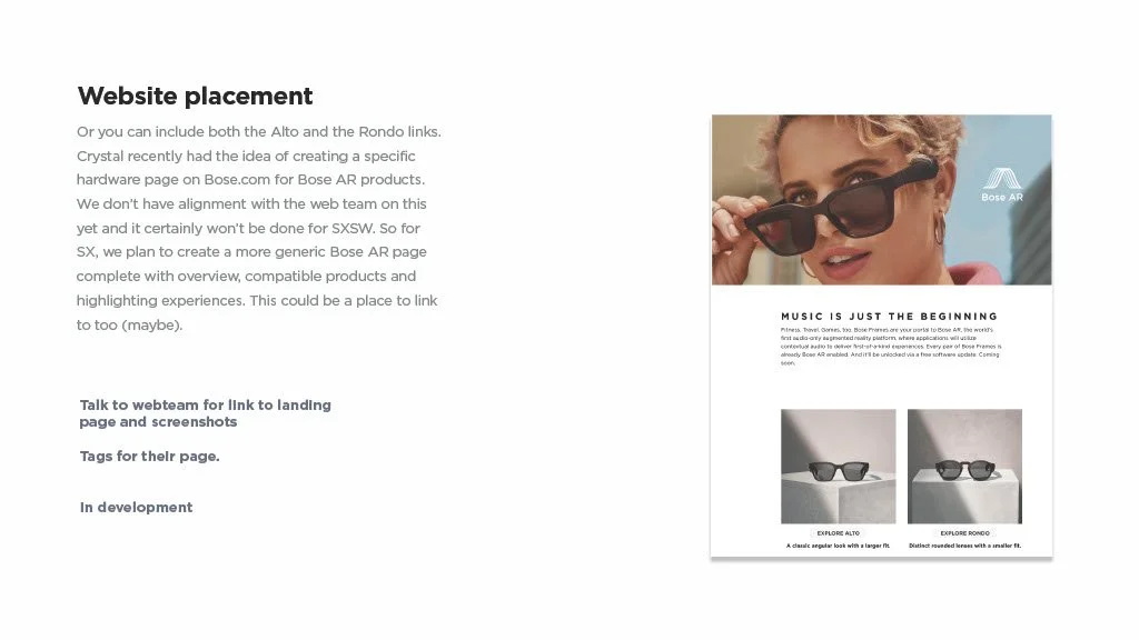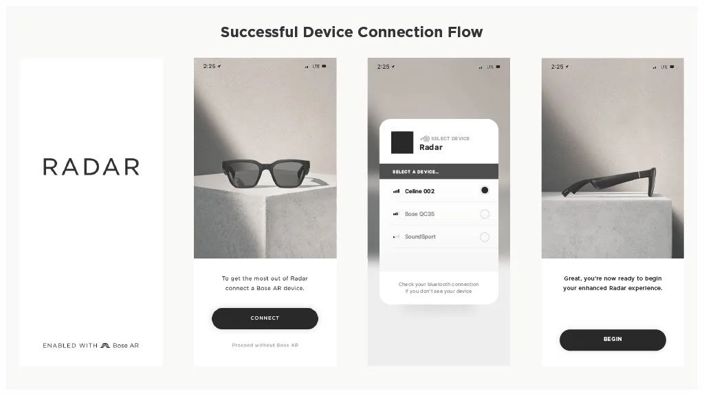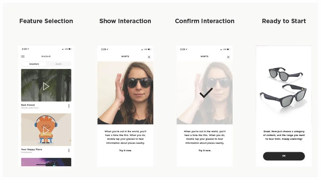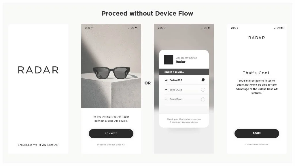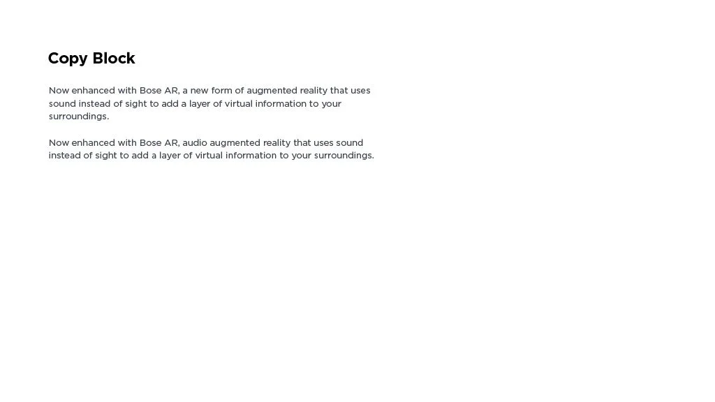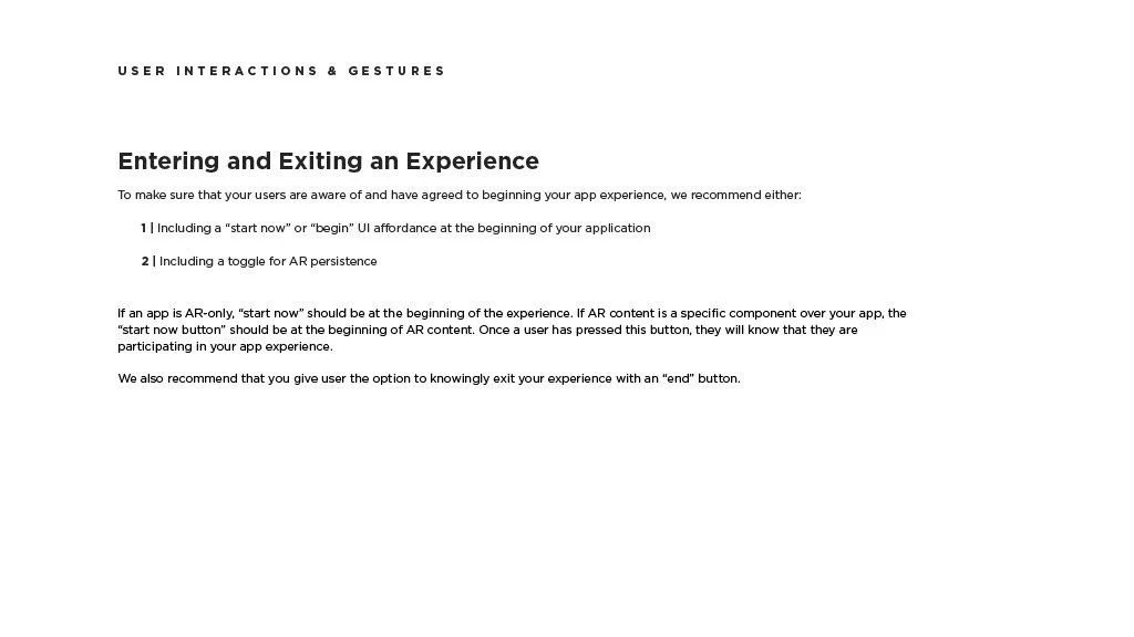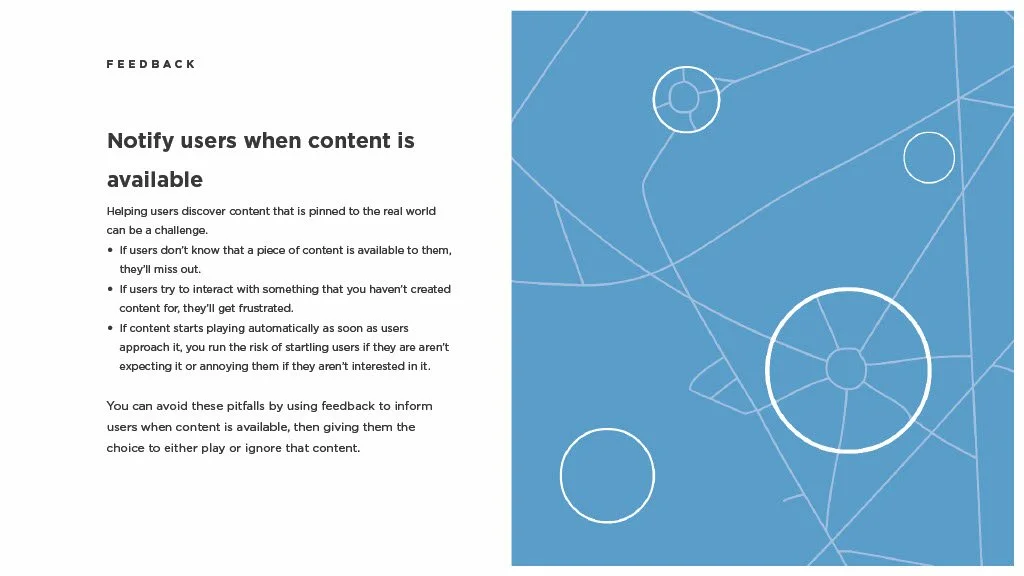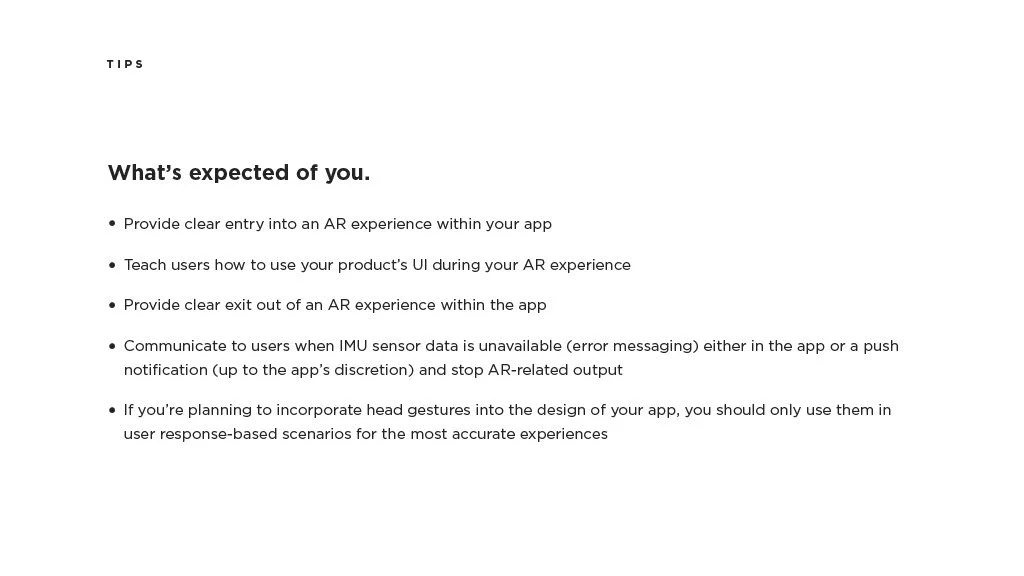 As a Principal Designer at Bose in the Bose labs department, I lead a cross-disciplinary team to create a comprehensive set of Design Guidelines for the companies Audio Augmented Reality platform, Bose AR. this document was created to inform and empower both our internal teams across departments, as well as our direct company partnerships, and independent developers. The information in this document spans information on the technical specifications, design patterns, and branding of the platform.