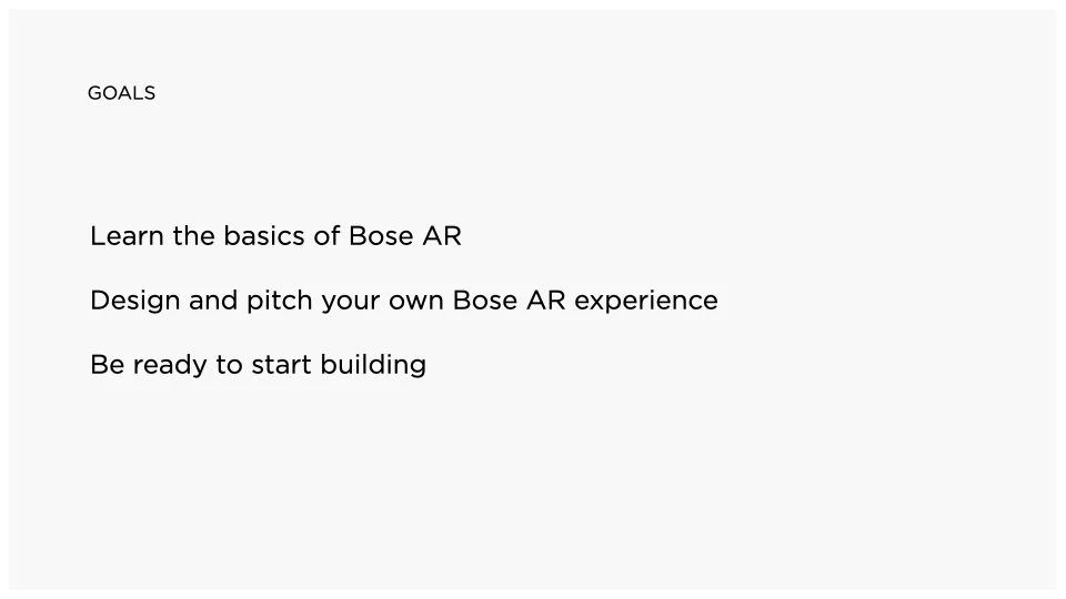 As part of my responsibilities on Bose AR, I was tasked with helping to popularize and evangelize the platform to the software developer community. In order to achieve this goal, our team set up a series of workshops at community shared workspaces across the country (NYC, Austin, San Francisco).